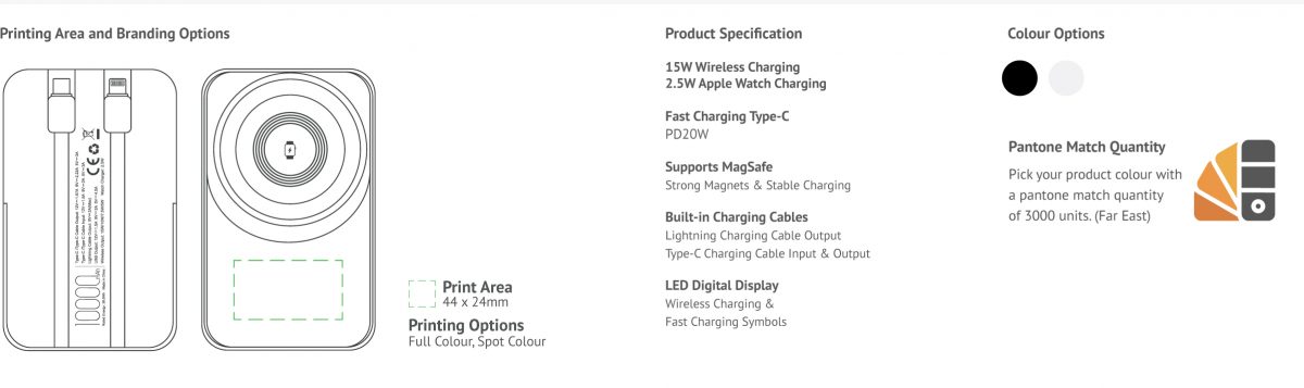 The 10,000mAh MagSafe Powerbank is designed for ultimate versatility and performance. It features 15W wireless charging with MagSafe compatibility and 2.5W charging for your Apple Watch, making it easy to charge all your Apple devices. Equipped with a built-in Lightning cable and a Fast Charging Type-C cable that supports both input and output, ensuring compatibility with various devices.