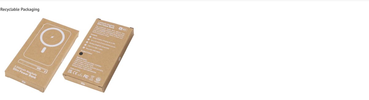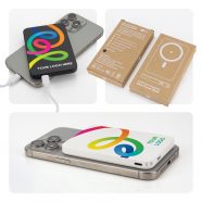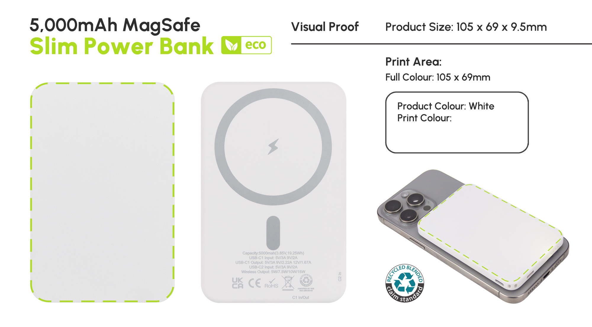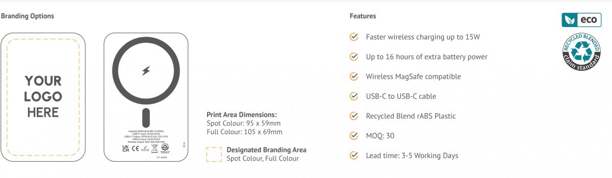 The 5,000mAh Power Bank delivers reliable everyday power with a MagSafe-compatible design that securely attaches to your phone for effortless charging. Offering up to 16 hours of extra battery life and fast 15W wireless charging, it also includes a Type-C cable for charging compatible devices when needed. Made from recycled materials, it combines performance with sustainability, while the smooth surface offers a very clear, full-colour, edge-to-edge branding area for maximum visual impact.