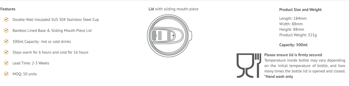 • Bamboo Lined Base & Sliding Mouth-Piece Lid
