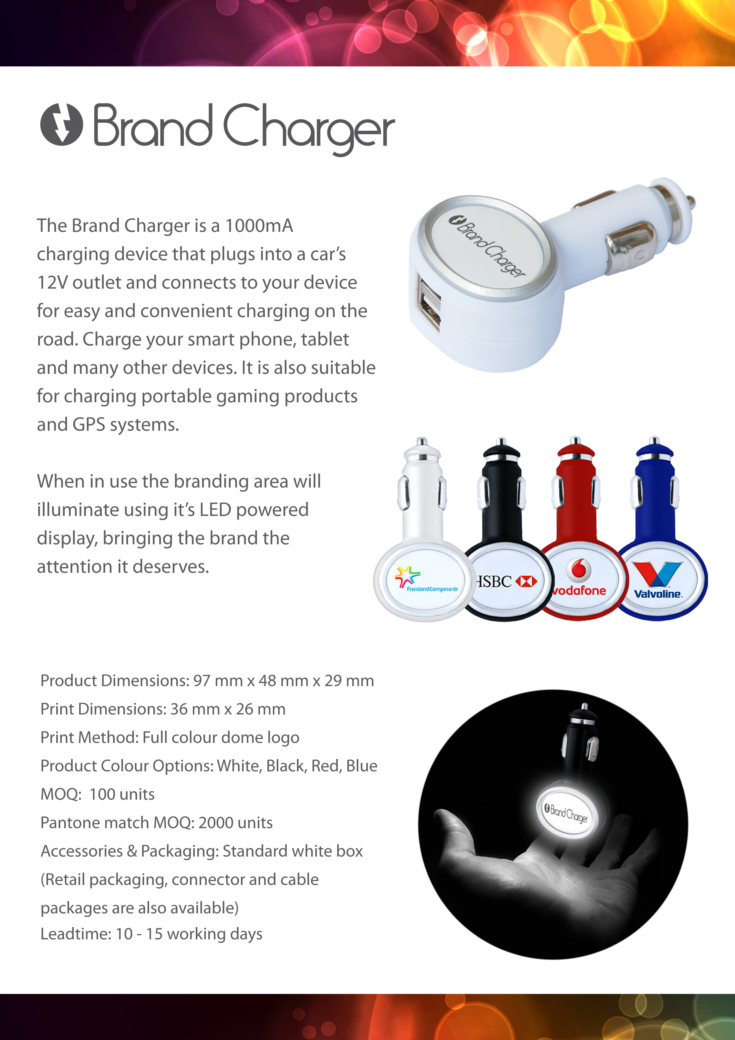 The Brand Charger is a 1000mA charging device that plugs into a car’s 12V outlet and connects to your device for easy and convenient charging on the road. Charge your smart phone, tablet and many other devices. It is also suitable for charging portable gaming products and GPS systems. When in use the branding area will illuminate using it’s LED powered display, bringing the brand the attention it deserves.