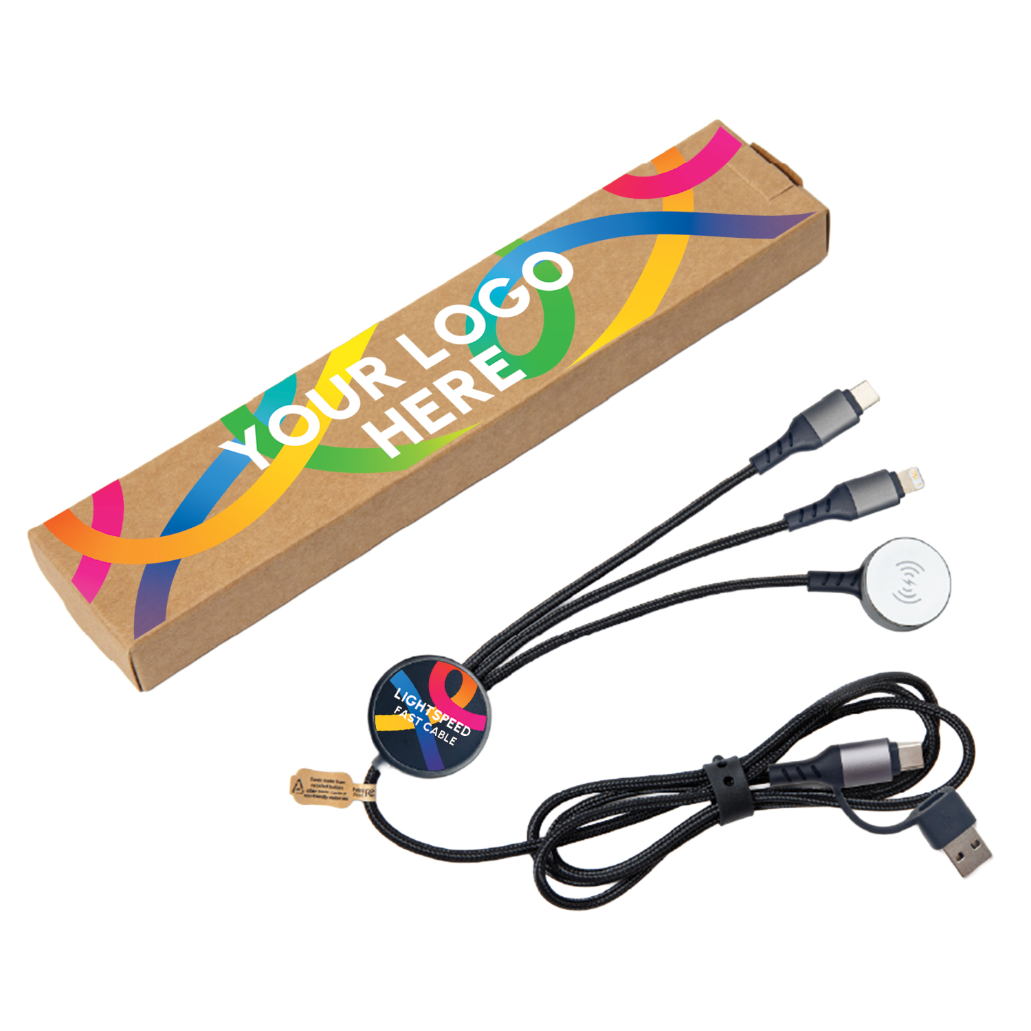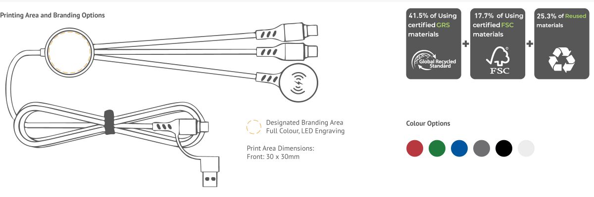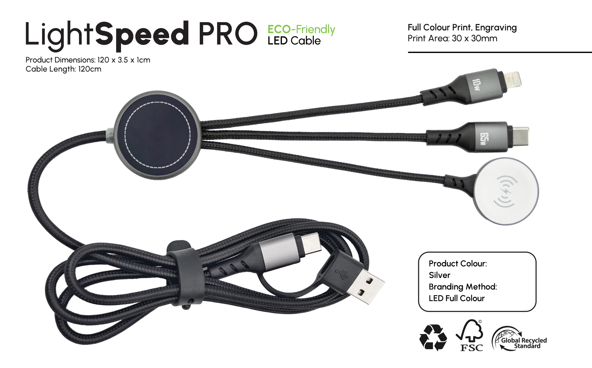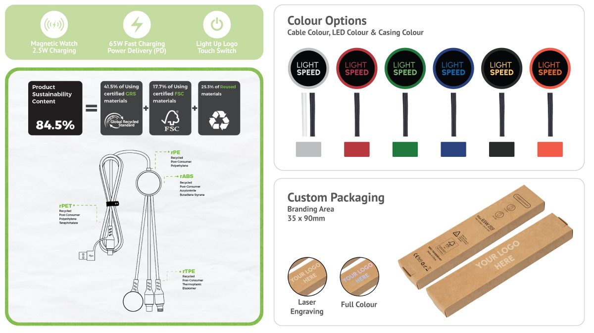 Light Speed Pro is designed for maximum brand impact, combining 65W fast charging and secure data transfer with added versatility through integrated Lightning and Type-C cables, plus a 2.5W Apple Watch® charger. Made from 84.5% sustainable materials, it features a premium full-colour LED-engraved logo for eye-catching illuminated branding, making it a powerful, everyday promotional charging solution. Add optional NFC technology to instantly link users to websites, campaigns, or digital profiles, turning every cable into a smart promotional tool.
