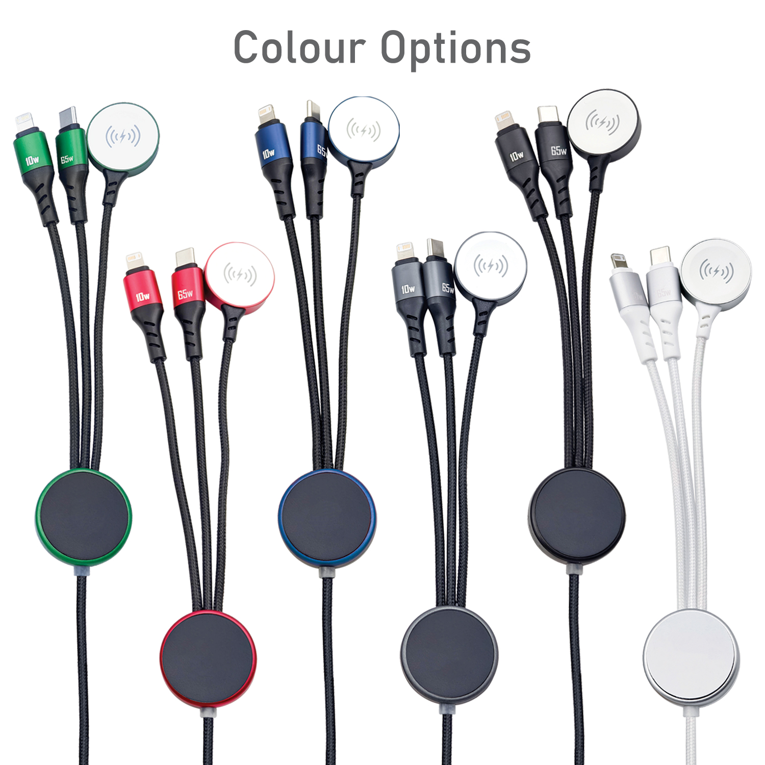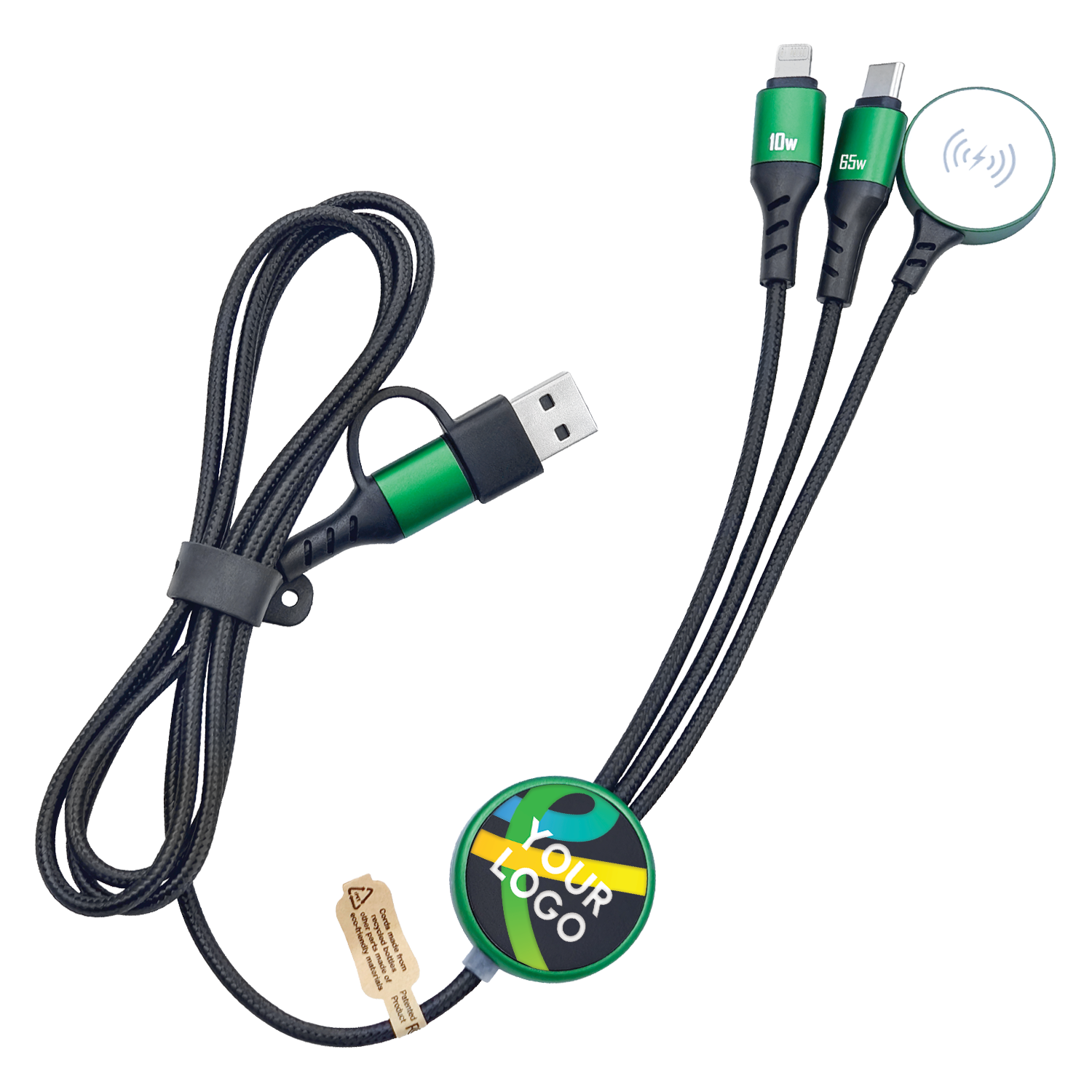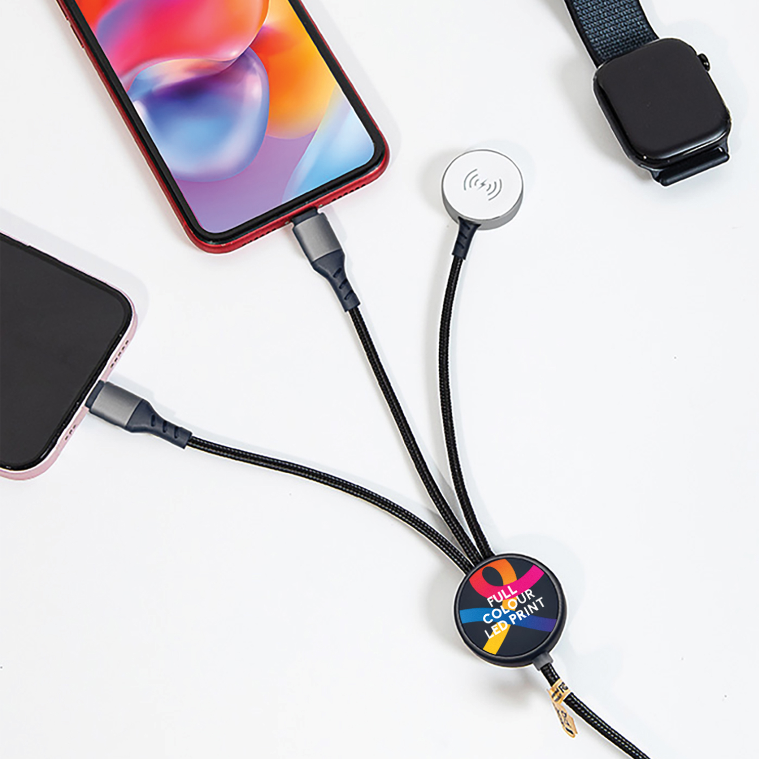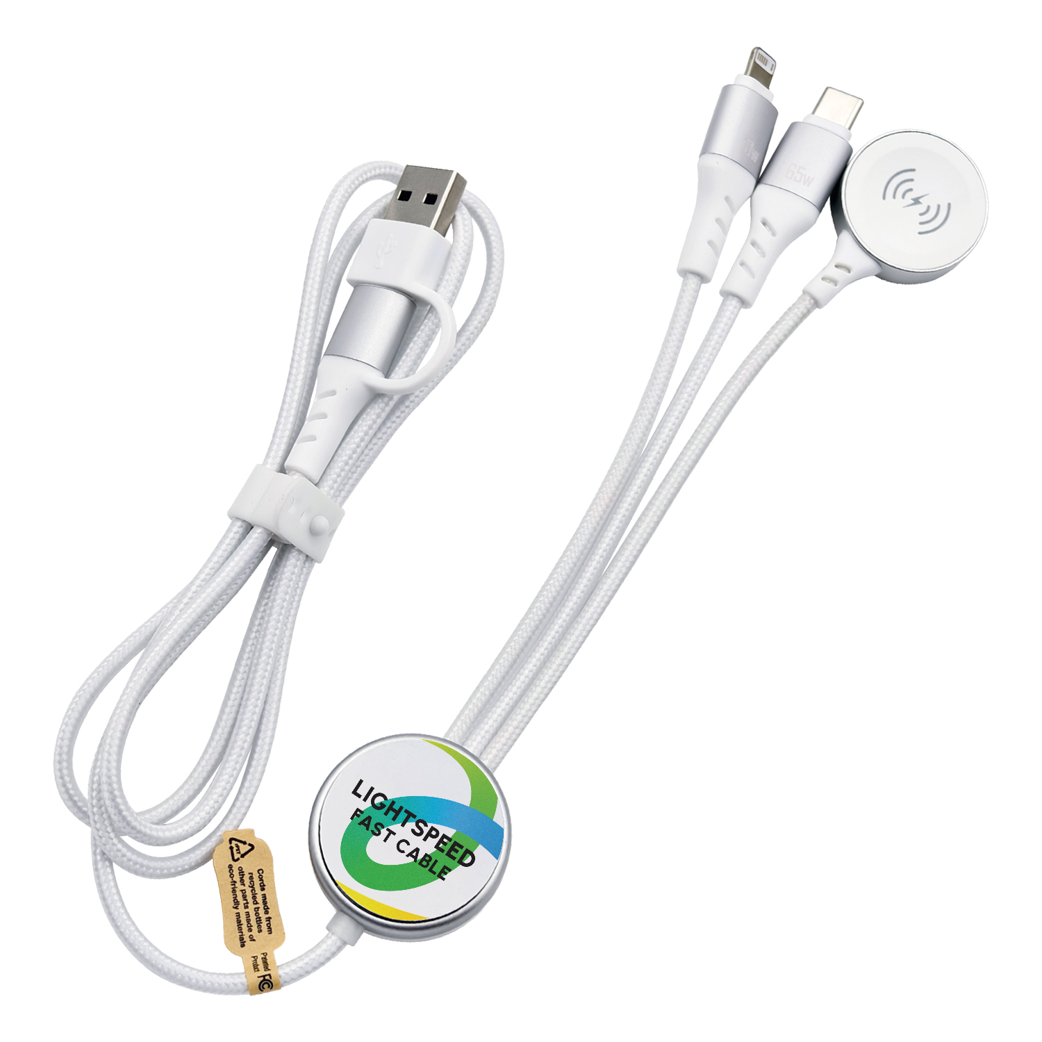 Light Speed Pro is designed for maximum brand impact, combining 65W fast charging and secure data transfer with added versatility through integrated Lightning and Type-C cables, plus a 2.5W Apple Watch® charger. Made from 84.5% sustainable materials, it features a premium full-colour LED-engraved logo for eye-catching illuminated branding, making it a powerful, everyday promotional charging solution. Add optional NFC technology to instantly link users to websites, campaigns, or digital profiles, turning every cable into a smart promotional tool.